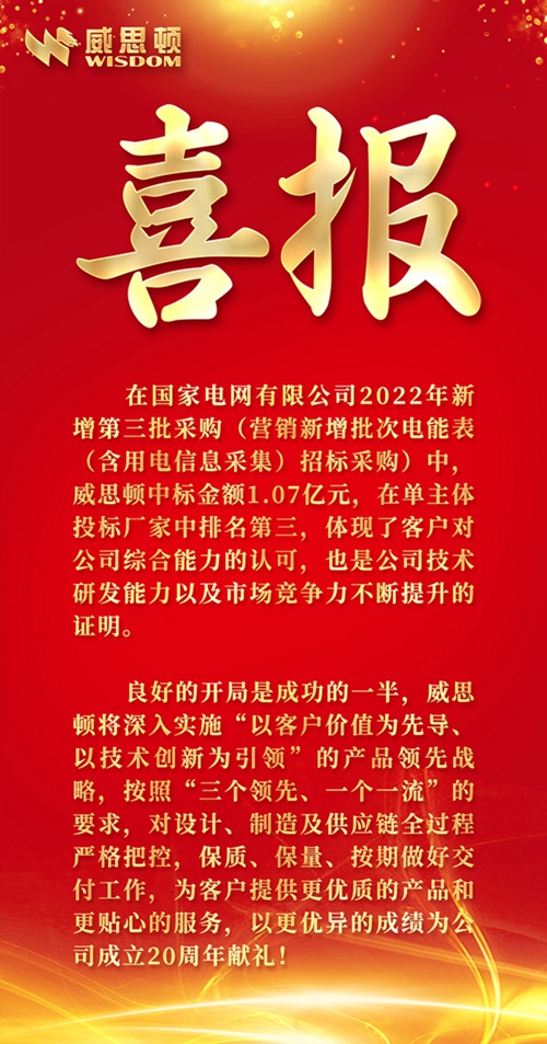 喜报!威思顿中标2022年国网公司新增第三批采购项目1.07亿元